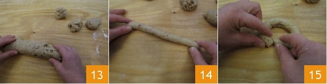 Travaillez la pâte avec vos mains pour obtenir un rouleau 13 à partir duquel vous pourrez prélever 11 morceaux d'environ 75 grammes chacun, simplement en les détachant à la main, pour préserver l'intégrité des amandes entières. Roulez les morceaux pour obtenir des boudins d'environ 20 centimètres 14, puis rejoignez les deux extrémités 15 pour former un petit anneau.