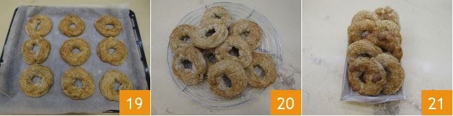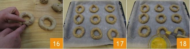Pincez les deux extrémités avec vos doigts pour les sceller, afin qu'elles conservent leur forme pendant la cuisson 16. Transférez les anneaux sur une plaque recouverte de papier sulfurisé 17 et badigeonnez la surface avec de l'œuf légèrement battu 18. Si vous décidez d'ajouter les 30 grammes d'amandes facultatives pour décorer la surface, vous pouvez le faire maintenant, après avoir badigeonné les petits anneaux.