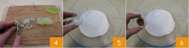 Coupez le cédrat confit en dés 4 et consacrez-vous à la pâte : dans un bol, mélangez la farine T45 avec le sucre et le bicarbonate (si vous voulez respecter la recette traditionnelle, utilisez de l'ammoniaque alimentaire à la place du bicarbonate, dans les mêmes proportions) 5, puis le mélange d'épices indiqué (ou selon la recette traditionnelle, le pisto) 6.