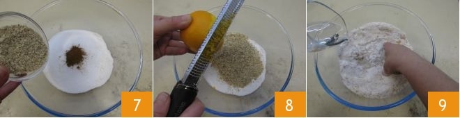 et les amandes hachées 7. Râpez le zeste de ¼ d'orange 8 et pétrissez en versant l'eau à température ambiante en filet 9 jusqu'à obtenir une pâte très compacte et sèche.