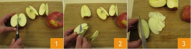 Pour préparer les petites roses feuilletées aux pommes, commencez par mettre une casserole pleine d'eau sur le feu, puis passez à nettoyer les pommes : coupez-les en quartiers 1, enlevez le trognon avec un couteau 2 ou avec l'outil approprié. Ensuite, coupez les pommes en tranches très fines 3.