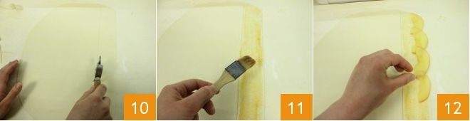 À l'aide d'une roulette à pâte lisse, découpez dans chaque feuille 6 bandes de pâte d'environ 5 cm de large 10. Badigeonnez chaque bande avec la confiture d'abricots 11, épongez les tranches de pomme avec une feuille de papier absorbant et déposez-les le long de chaque bande, légèrement superposées : la partie avec la peau doit dépasser d'un côté de la bande de pâte feuilletée 12.