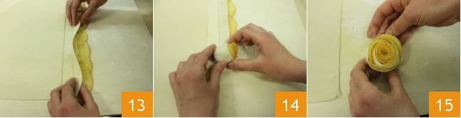 Ensuite, repliez la bande restante de pâte feuilletée sur les pommes 13 et enroulez-la sur elle-même en partant d'une des deux extrémités les plus étroites 14 ; fixez bien la dernière partie et vous aurez ainsi composé une petite rose 15.
