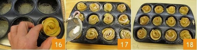 Placez chaque petite rose à l'intérieur d'un des trous du moule 16 et une fois que vous les aurez toutes finies, saupoudrez de sucre glace 17. Faites cuire dans un four statique préchauffé à 170°C pendant 45 minutes. Une fois cuites, sortez les petites roses feuilletées aux pommes 18 et avant qu'elles ne refroidissent, démoulez-les, sinon en refroidissant le sucre aura tendance à se solidifier et il pourrait être difficile de les détacher.