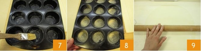 Maintenant, occupez-vous de beurrer un moule à muffins en utilisant un pinceau et du beurre ramolli 7, puis tapissez chaque section avec le sucre de canne 8. Prenez la pâte feuilletée et étalez-la de manière à obtenir deux rectangles 9.