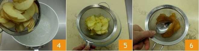 Lorsque l'eau arrive à ébullition, versez les pommes et faites-les bouillir pendant 1 minute, jusqu'à ce qu'elles soient ramollies sans se défaire. Ensuite, éteignez le feu, égouttez-les 5 et laissez-les refroidir. À ce stade, vous pouvez passer la confiture d'abricots au tamis pour la rendre plus crémeuse (c'est une étape facultative) 6.