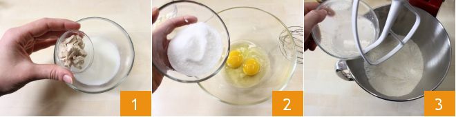 Pour préparer le Roscón de Reyes, commencez par dissoudre la levure de boulanger émiettée dans un peu de lait 1 (prélevé sur la quantité totale prévue par la recette), puis mettez-la de côté. Dans un bol, fouettez les œufs avec le sucre semoule 2, à l'aide d'un batteur électrique, jusqu'à obtenir un mélange mousseux. Dans le bol d'un robot avec la feuille, mettez la farine tamisée, mettez l'appareil en marche à une vitesse modérée et ajoutez la levure 3,