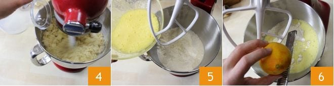 le lait restant 4 et les œufs battus avec le sucre 5. Ajoutez le zeste râpé d'une orange et le sel 6. Lorsque les ingrédients sont bien amalgamés, remplacez la feuille par le crochet.