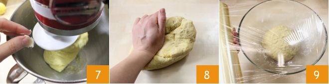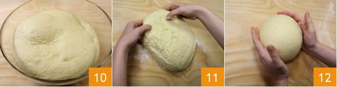 Enfin, ajoutez le beurre mou morceau par morceau, n'en ajoutant pas un autre tant que le précédent n'est pas absorbé 7. Cette opération prendra environ 15-20 minutes. Une fois ce temps écoulé, transférez le mélange sur un plan de travail légèrement fariné et travaillez-le juste assez pour obtenir un composé lisse, élastique et non collant 8. Formez une boule et placez-la dans un bol recouvert d'un film plastique 9, puis laissez lever le tout dans un endroit tiède et sans courants d'air (par exemple, le four éteint et fermé mais avec la lumière allumée) pendant environ 4 heures,