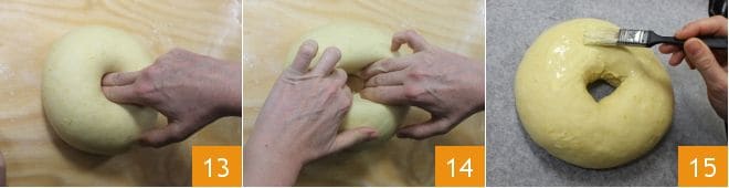 puis faites un trou au centre avec deux doigts et élargissez le trou pour créer une couronne (13-14). Transférez le roscón sur une plaque recouverte de papier sulfurisé et badigeonnez-le avec un jaune d'œuf battu avec 2 cuillères à soupe de crème 15.