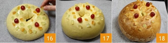 Décorez la surface du Roscón de Reyes avec des fruits confits au goût 16 et remettez le tout dans le four éteint, à lever pendant 2 heures supplémentaires. Lorsque le gâteau a doublé de volume 17, faites-le cuire dans un four statique à 180°, pendant au moins 30 minutes 18. Une fois cuit, retirez la couronne du four et laissez-la refroidir sur une grille, puis saupoudrez-la de sucre glace : le Roscón de Reyes est prêt !