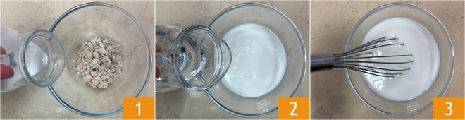 Pour préparer les roses en feuilleté, commencez par émietter la levure fraîche dans un bol 1, puis ajoutez le lait 1 et l'eau froide 2. Mélangez avec un fouet pour dissoudre la levure 3.