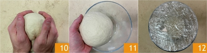 Travaillez la pâte sur le plan de travail jusqu'à former une boule lisse 10, puis placez-la dans le bol 11 et couvrez avec plusieurs couches de film plastique 12. Laissez lever au réfrigérateur pendant toute la nuit.
