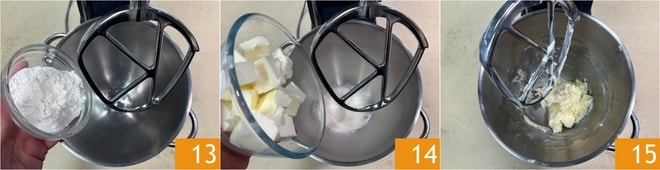 Préparez maintenant le beurre pour le feuilletage : dans le robot pâtissier équipé d'une feuille, versez la farine 13 et le beurre ramolli 14. Mélangez jusqu'à obtenir un mélange homogène, en faisant attention à ne pas trop le travailler 15.