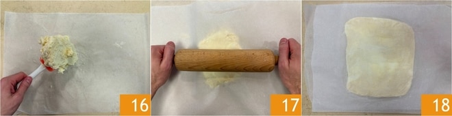 Transférez le mélange sur une feuille de papier sulfurisé 16, couvrez avec une autre feuille de papier sulfurisé et étalez avec le rouleau à pâtisserie 17 jusqu'à former un carré d'environ 20x20 cm, d'une épaisseur d'environ 1 cm 18. Placez-le également au réfrigérateur pour reposer.