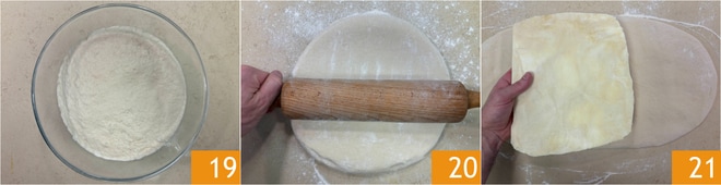 Repliez les deux bords latéraux vers l'intérieur 22 de manière à couvrir le carré de beurre, en veillant à faire coïncider les bords de la pâte exactement au milieu 23. Étalez à nouveau la pâte avec le rouleau dans le sens des plis, en commençant d'abord par de petites pressions pour éviter de casser le beurre à l'intérieur. Vous devez obtenir un autre rectangle 24.
