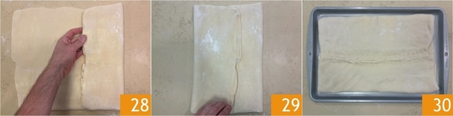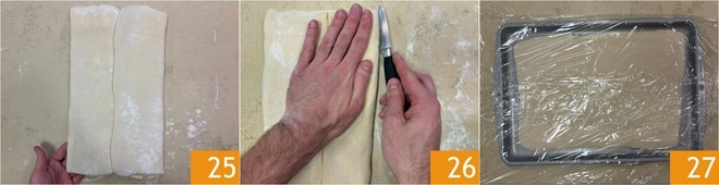 À ce stade, effectuez un tour à 3 en repliant les bords latéraux vers le centre et en les faisant coïncider 25. Avec un couteau bien aiguisé, incisez les côtés du rectangle obtenu dans la longueur 26. Transférez la pâte sur un plateau, couvrez de film plastique 27 et placez au réfrigérateur pour refroidir pendant 30 minutes.