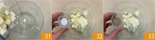 Consacrez-vous à la garniture : mettez le beurre pommade dans un bol 31, puis ajoutez le sel 32 et le cardamome en poudre 33.