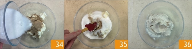 Ajoutez également le sucre 34 et mélangez le tout avec une maryse 35 jusqu'à obtenir un mélange homogène 36. Réservez à température ambiante.