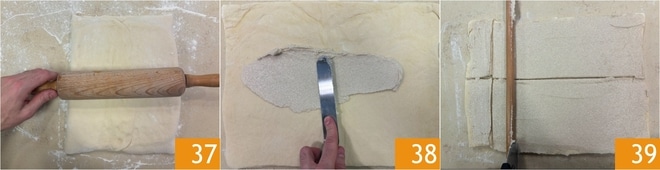 Après le temps de refroidissement, reprenez la pâte et étalez-la avec le rouleau 37 jusqu'à former un rectangle d'environ 30x40 cm, d'une épaisseur de 5 mm. Recouvrez la surface avec la crème au beurre et cardamome en l'étalant avec une spatule 38. À ce stade, divisez le rectangle en deux dans la longueur et coupez-le en bandes d'environ 15x5 cm 39; vous devriez obtenir 16 bandes de pâte.
