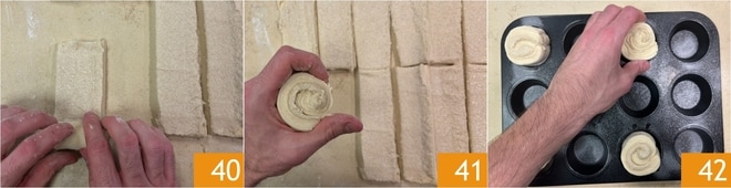 Roulez chaque bande 40 pour former des spirales 41. Placez les spirales au fur et à mesure dans un moule à muffins bien beurré, en veillant à les espacer les unes des autres 42. Laissez lever dans le four éteint avec la lumière allumée pendant environ 3 heures, en les vaporisant de temps en temps avec un peu d'eau pour éviter que la surface ne sèche.