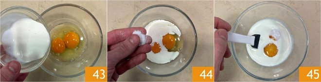 Entre-temps, versez l'œuf, le jaune d'œuf et la crème dans un petit bol 43, ajoutez le sel 44 et mélangez 45.