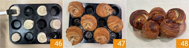 Une fois le temps de levage écoulé, badigeonnez les spirales avec le mélange de crème 46 et faites cuire dans un four ventilé préchauffé à 180°C pendant environ 6 minutes, puis insérez une boule de papier d'aluminium dans la porte pour la maintenir légèrement ouverte et poursuivez la cuisson pendant environ 12 minutes. Lorsqu'elles seront bien dorées, sortez-les du four 47 et servez vos magnifiques roses en feuilleté 48 !