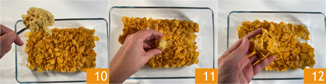 Prélevez des cuillerées de pâte 10 et plongez-les une à une dans les céréales entiers 11, en les retournant pour bien les enrober, et en les compactant légèrement 12.