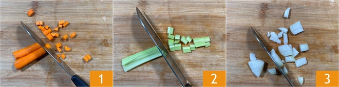 Pour préparer le rôti de veau à la poêle, commencez par préparer le bouillon de légumes, en suivant notre recette, et gardez-le au chaud. Hachez au couteau les carottes 1, le céleri 2 et l'oignon 3.