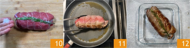 Procédez à la ficelage de la noix de veau en insérant une branche de romarin. Salez la viande de tous les côtés 10. Versez un filet d'huile dans la poêle et faites dorer le rôti de tous les côtés 11 à feu moyen-vif. Retirez-le de la poêle et transférez-le dans un plat à four 12.
