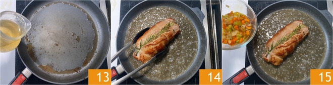 Versez dans la poêle le vin blanc 13 et déglacez le fond. À ce stade, remettez le rôti dans la poêle 14 et ajoutez les légumes 15.