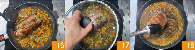 Ajoutez le bouillon 16, couvrez avec un couvercle 17 et faites cuire pendant 50 minutes à feu moyen-doux, en retournant à mi-cuisson 18. Le rôti doit rester humide, donc, avec une cuillère, vous devrez souvent l'arroser avec son jus de cuisson. Si vous avez la possibilité de mesurer la température interne de la viande, le rôti sera prêt à une température entre 60-65°C.