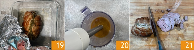 Transférez le rôti dans un plat à four, couvrez-le d'une feuille d'aluminium 19 et laissez-le reposer pendant 50-60 minutes. Pendant ce temps, transférez les légumes dans un récipient et, avec un mixeur plongeant, mélangez jusqu'à obtenir une crème lisse et homogène 20. Goûtez et, si nécessaire, ajustez le sel et le poivre. Après le temps de repos, tranchez le rôti en essayant de faire des tranches d'environ 1 cm d'épaisseur 21.