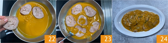 Versez dans la poêle la crème et faites chauffer pendant quelques instants, puis ajoutez les tranches de rôti 22. Couvrez les tranches avec la crème 23, fermez avec un couvercle et faites cuire pendant 2 minutes. Servez et complétez avec du romarin frais. Votre rôti de veau à la poêle est prêt à être dégusté 24 !