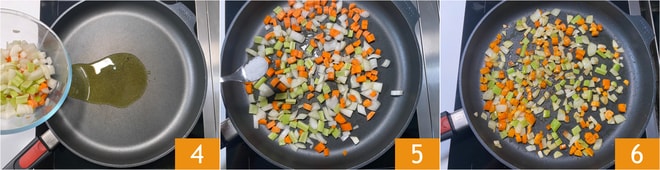 Dans une poêle, versez un filet d'huile, ajoutez les légumes 4, salez 5 et faites revenir à feu moyen-doux pendant environ 10 minutes 6, puis transférez-les dans un bol.