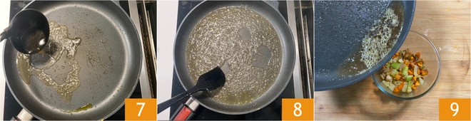 Versez dans la poêle une louche généreuse de bouillon de légumes 7 et déglacez le fond de la poêle 8 pour obtenir une sauce légèrement réduite. Transférez le liquide sur les légumes 9.