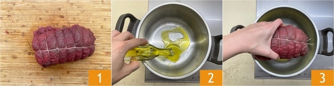 Pour préparer le rôti à l'autocuiseur, commencez par prendre le morceau de viande ficelé 1, sinon lisez notre fiche : Comment ficeler le rôti pour le faire vous-même. Versez un filet d'huile dans un autocuiseur de 4,5 L 2 et chauffez-le à feu moyen-élevé. Insérez ensuite le rôti à l'intérieur 3.