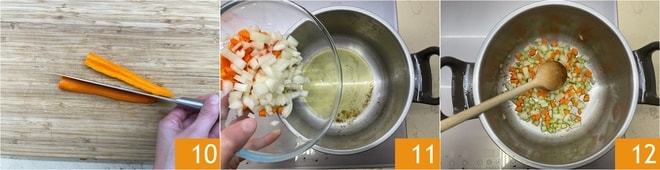 Faites de même avec la carotte 10. Versez encore un filet d'huile dans la même casserole et ajoutez les légumes 11. Laissez-les mijoter à feu moyen-doux 12.