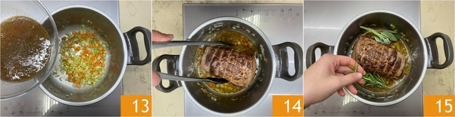 Versez le fond de cuisson que vous aviez réservé 13, replacez le rôti à l'intérieur 14 et ajoutez les herbes aromatiques 15.