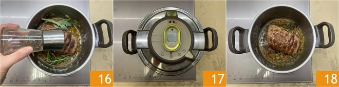 Ajoutez aussi une pincée de sel et un peu de poivre moulu 16. Fermez l'autocuiseur 17 et faites cuire toujours à feu moyen-élevé. Dès qu'il sera en pression (vous entendrez un sifflement continu), réduisez le feu pour le rendre moyen et comptez 20 minutes. Une fois ce temps écoulé, éteignez et laissez l'autocuiseur se dépressuriser complètement. Dès qu'il n'est plus sous pression, vous pouvez ouvrir le couvercle. Le rôti à l'autocuiseur est prêt 18 !