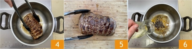 Faites-le bien dorer de tous les côtés en le tournant de temps en temps avec des pinces 4, en essayant de ne pas le percer. Transférez-le ensuite sur une planche à découper 5 et versez dans la casserole le vin blanc 6.