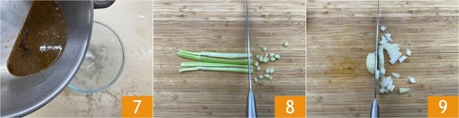 Déglacez le fond de cuisson et versez le liquide dans un petit bol 7. Hachez grossièrement le céleri 8 et l'oignon 9.