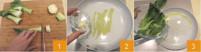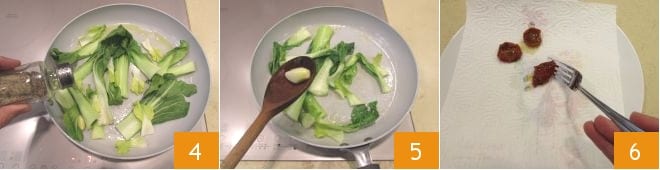Pour préparer les roulés salés avec cœur fondant, commencez par laver les pak choi et éliminer la base de la tige 1. Faites revenir l'ail dans l'huile placée dans une poêle antiadhésive 2, puis ajoutez les pak choi 3