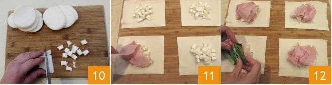 Coupez la provola en tranches d'environ 1 cm d'épaisseur, et découpez-les en bâtonnets puis en dés 10. Occupez-vous maintenant de la composition des roulés au jambon : commencez par prendre une feuille de pâte feuilletée et coupez-la en 4 parties. Répartissez au centre de chaque carré des dés de scamorza et ajoutez le jambon 11. Continuez avec le pak choi 12,