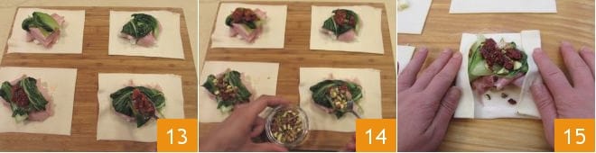 puis répartissez également les tomates séchées 13 et les pistaches 14. Il est temps de fermer les feuilletés : prenez les deux bords latéraux et repliez-les vers l'intérieur, au-dessus de la farce 15.