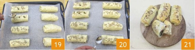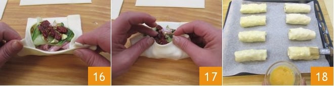 Prenez ensuite le bord inférieur de la pâte et repliez-le également sur la farce 16 et continuez à le rouler 17, jusqu'à obtenir des roulés. Procédez de la même manière pour les roulés végétariens : ils doivent être garnis de scamorza, pak choi, tomates séchées et noix. Enfin, disposez les 8 roulés obtenus sur une plaque recouverte de papier sulfurisé et badigeonnez-les d'œuf légèrement battu 18.