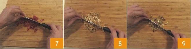 puis hachez-les grossièrement 7. Faites de même avec les noix 8 et les pistaches 9.