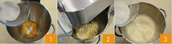 Pour préparer le roulé à la crème de noisettes, commencez par la préparation du biscuit : dans le bol d'un robot, versez les œufs et une partie du sucre 1 : vous devrez ajouter le sucre en trois fois, au fur et à mesure que vous mettez en marche le robot 2. Une fois terminé, arrêtez le robot et versez la farine tamisée 3, en mélangeant avec une spatule souple.