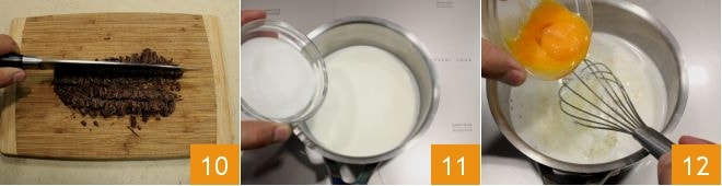 Hachez finement le chocolat noir 10, puis versez le lait dans une casserole avec le sucre 11. Faites chauffer et dès qu'il commence à bouillir, retirez du feu, ajoutez les jaunes d'œufs en mélangeant avec un fouet pour les casser 12. Remettez sur le feu quelques minutes et dès que cela bout à nouveau, éteignez