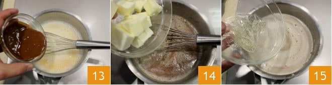 puis versez la crème de noisettes 13 et le beurre en morceaux 14. Laissez tiédir quelques minutes, puis ajoutez les feuilles de gélatine préalablement égouttées et bien essorées 15; faites-les fondre complètement en mélangeant toujours avec le fouet.